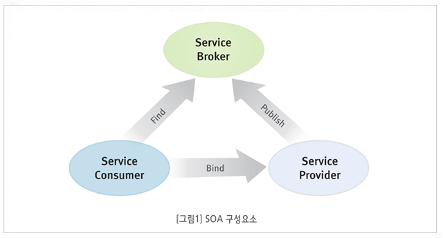 (Autonomous Service)°¡ ¸Þ½ÃÁö ±â¹Ý(Message-Based)À¸·Î ¼·Î Ä¿¹Â´ÏÄÉÀ̼ÇÇϵµ·Ï ¼ÒÇÁÆ®¿þ¾î ½Ã½ºÅÛÀ» ¼³°èÇÏ´Â ¹æ½ÄÀ» Á¤ÀÇÇÏ´Â ÀÏÁ¾ÀÇ ¾ÆÅ°ÅØÃ³ ½ºÅ¸ÀÏ(Architectural Style)·Î SOA¸¦ Á¤ÀÇÇÑ´Ù. ÀÌ °üÁ¡¿¡¼´Â SOA´Â ´ÙÀ½°ú °°ÀÌ ¼ºñ½º °ø±ÞÀÚ(Service Provider)¿Í ¼ÒºñÀÚ(Service Consumer), ±×¸®°í ¼ºñ½º ºê·ÎÄ¿(Service Broker) µî 3°³ÀÇ ÁÖ¿ä ¿ä¼Ò·Î ±¸¼ºµÈ´Ù. |
