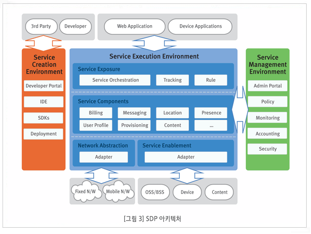 Áö±Ý±îÁö SOA¿Í SDP¿ÍÀÇ °ü°è¿¡ ´ëÇØ ¾Ë¾Æº¸¾Ò´Ù. ÀÌÁ¦ SDP ¾ÆÅ°ÅØÃ³¿¡ ´ëÇØ Á»´õ ÀÚ¼¼È÷ ¾Ë¾Æº¸±â·Î ÇÏÀÚ. SDPÀÇ ¾ÆÅ°ÅØÃ³´Â Åë½Å ¾÷ü ¶Ç´Â ¼Ö·ç¼Ç º¥´õ¸¶´Ù Á¶±Ý¾¿ Â÷À̰¡ ÀÖÁö¸¸, Åë»óÀûÀ¸·Î ¼ºñ½º »ý¼º ȯ°æ (Service Creation Environment), ¼ºñ½º ½ÇÇà ȯ°æ(Service Execution Environment), ±×¸®°í ¼ºñ½º °ü¸® ȯ°æ(Service Management Environment)ÀÇ 3°¡Áö °èÃþÀ¸·Î ±¸¼ºµÈ´Ù.